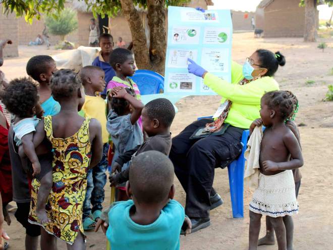 In the “Education and Prevention” stage of the project, we shared the preventive health measures in Kimbundo, the ethnic language of the region. Support was offered by local pastors who used loud speakers to promote health among their community members.